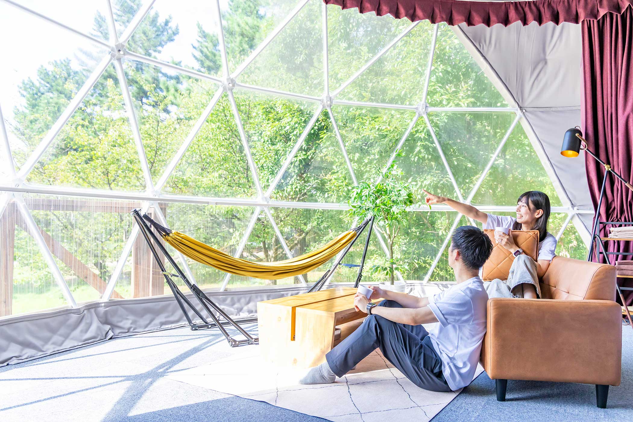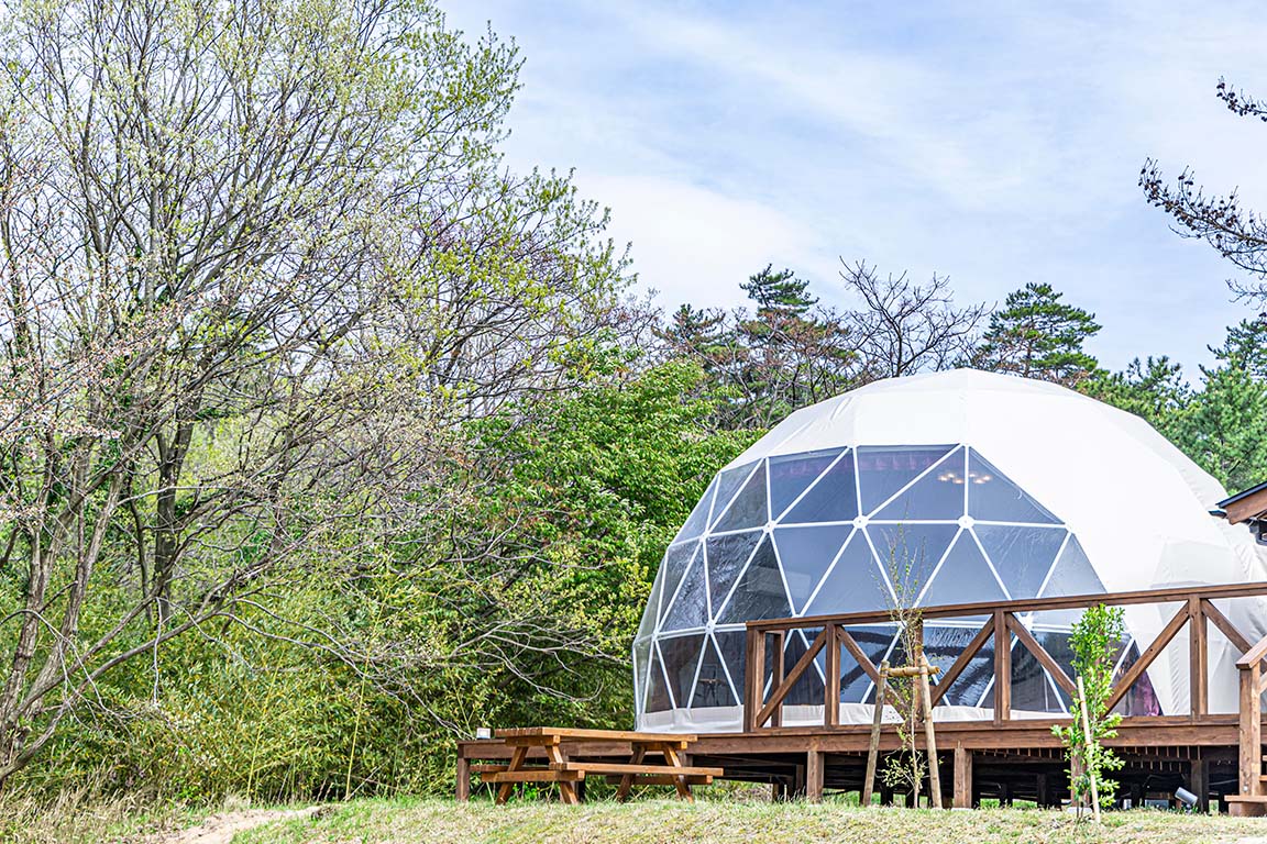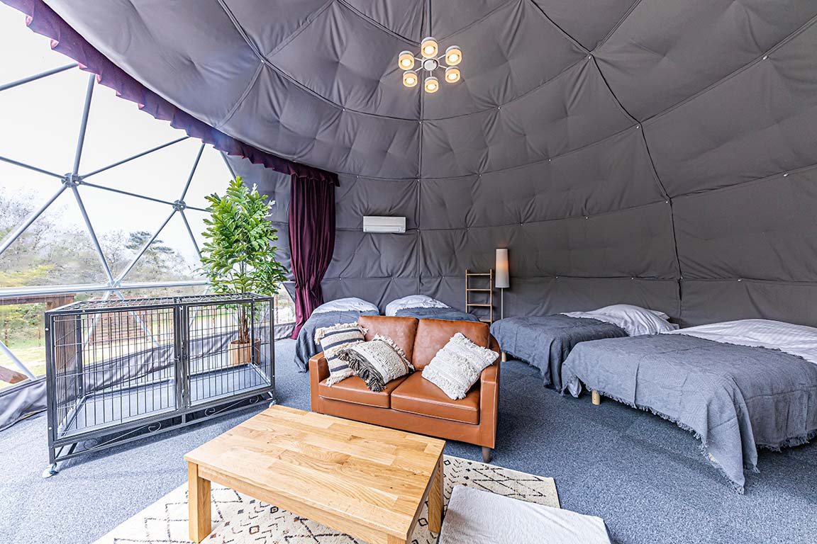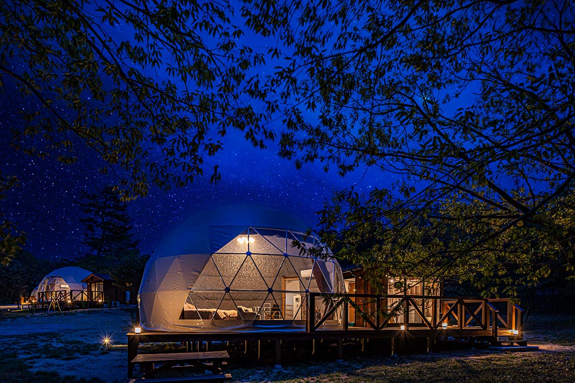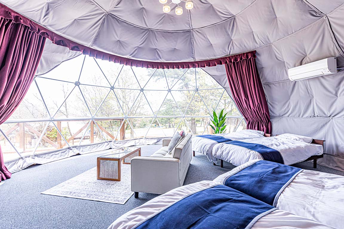 최신 돔 텐트에서는 냉·난방 시설을 완비하여 1년 내내 쾌적하게 머무르실 수 있습니다.